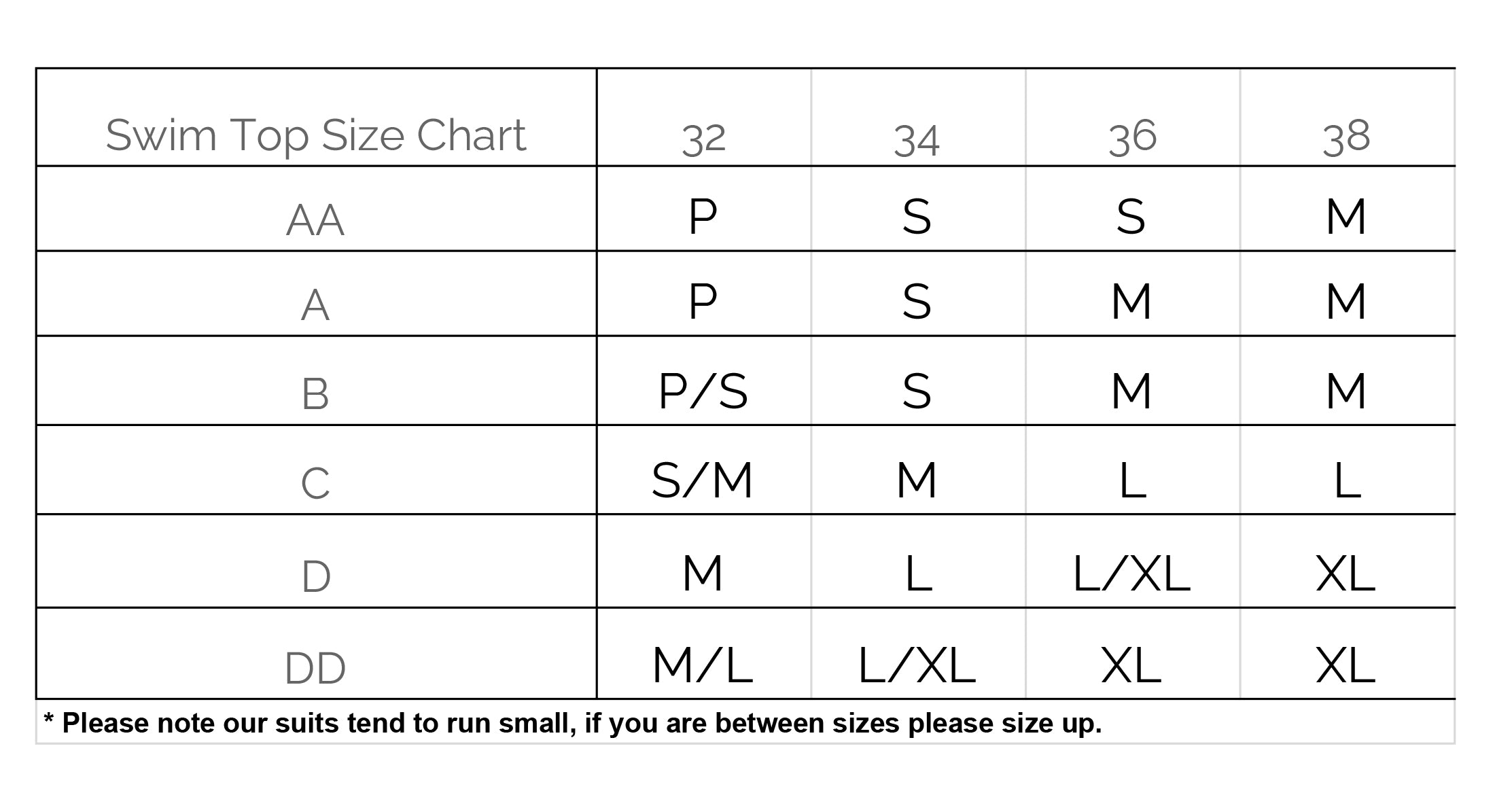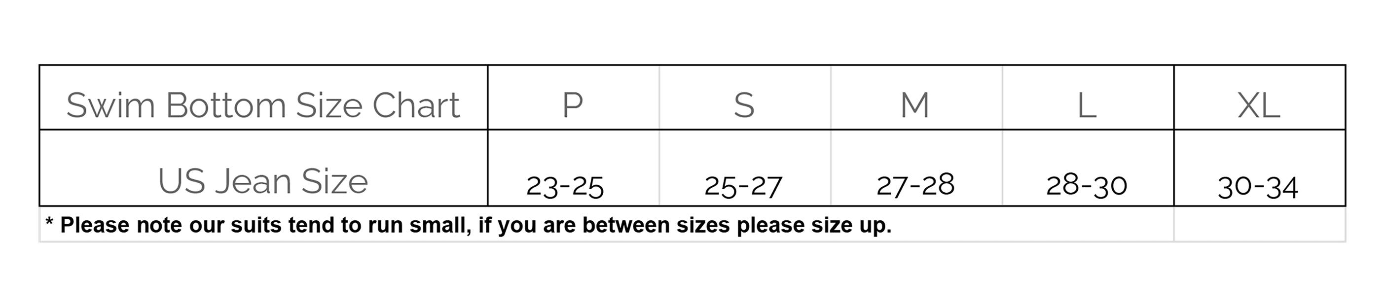 Here's our general size guide. If you are unsure about what size to get, we recommend sizing UP! Our bikinis do tend to run small.